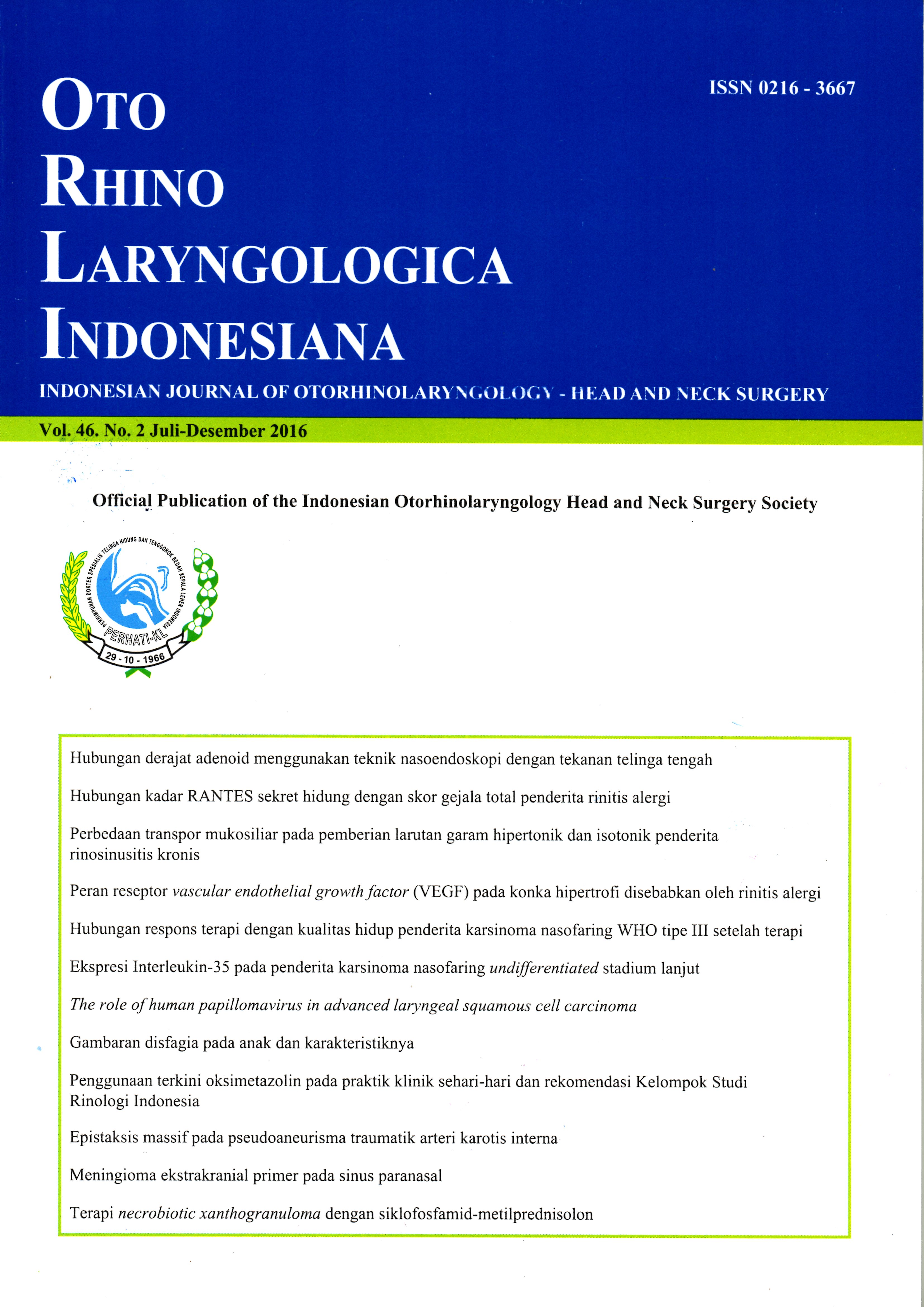 Latar belakang: Rinitis alergi (RA) adalah penyakit inflamasi mukosa hidung yang diperantarai oleh imunoglobulin E (IgE) akibat pajanan alergen. Salah satu tanda penting proses alergi adalah infiltrasi sel-sel inflamasi, utamanya eosinofil ke jaringan, dan melepaskan berbagai protein dasar yang dapat merusak epitel mukosa hidung. Proses tersebut sangat dipengaruhi oleh peran regulated upon activation normal T cell expressed and secreted (RANTES). Pengukuran beratnya gejala RA dilakukan secara subyektif dengan menghitung skor gejala total (SGT), serta obyektif melalui kadar RANTES sekret hidung. Tujuan: Penelitian ini bertujuan untuk membuktikan hubungan antara kadar RANTES sekret hidung dengan SGT pada penderita RA. Metode: Penelitian dilaksanakan pada bulan Juli-Desember 2015 di Unit Rawat Jalan Telinga Hidung Tenggorok - Bedah Kepala Leher Divisi Alergi Imunologi dan Instalasi Patologi Klinik Rumah Sakit Dr. Soetomo Surabaya. Jenis penelitian ini adalah analitik observasional dengan menggunakan rancang bangun cross sectional. Pengambilan sampel dilakukan secara consecutive sampling dan didapatkan sampel sebanyak 49. Kadar RANTES sekret hidung diukur dengan metode ELISA. Skor gejala total diperoleh dari penjumlahan keseluruhan gejala, baik gejala hidung maupun gejala di luar hidung. Uji korelasi yang digunakan adalah uji Pearson. Hasil: Rerata dan standar deviasi (SD) kadar RANTES pada penelitian ini adalah 17,68 pg/ml (8,24) dan rerata (SD) SGT adalah 11,37 (3,15 pg/ml). Diagram scatter plot menunjukkan bahwa data terdistribusi normal. Hasil tes korelasi Pearson kadar RANTES sekret hidung dan SGT pada penderita RA didapatkan koefisien korelasi (r) sebesar 0,426 dan p=0,002. Kesimpulan: Terdapat hubungan positif dengan korelasi sedang antara kadar RANTES sekret hidung dan SGT pada penderita RA.
